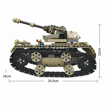Конструктор MOULD KING Танк с ДУ приходит на помощь во время выполнения сложных боевых операций. Представленный набором на 549 деталей, он предлагает к сборке модель военной техники, которую отличает дальнобойность огнестрельного оружия. Его корпус украшают круглые желтые фары и красные сигнальные огни системы наведения. Уникальной особенностью танка с дистанционным управлением является оригинальная структура ходовой части бронированной боевой машины. Представленная двумя гусеничными лентами, она окаймляет два горизонтально расположенных друг над другом ряда колес транспортного средства.